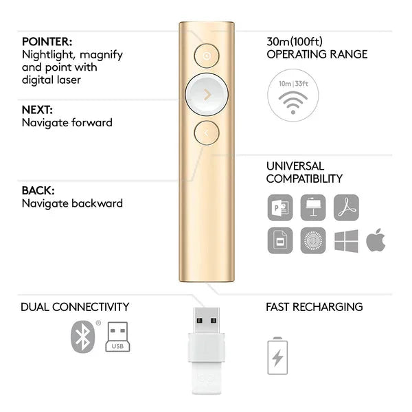Designed for effortless plug-and-play connectivity, Spotlight works with Windows, macOS, and major presentation software like PowerPoint, Keynote, Google Slides, and Prezi. Its fast 1-minute recharge provides 3 hours of use, making it the perfect tool for professionals and educators.
