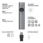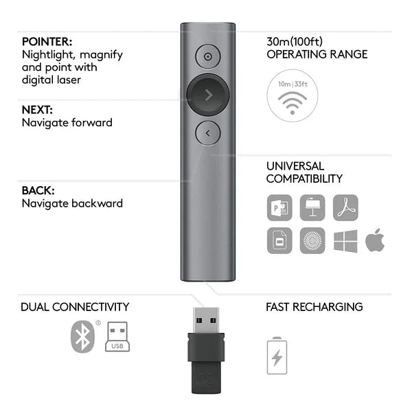 The Logitech Spotlight Presentation Remote is an advanced digital pointer designed to provide total control over presentations. Featuring three powerful pointing modes—Highlight, Magnify, and Digital Laser—it enhances audience engagement across projectors, TV screens, and video conferencing platforms. With a 100ft wireless range, customizable controls, and smart time management features, Spotlight ensures smooth and professional presentations in classrooms, corporate meetings, and virtual settings.